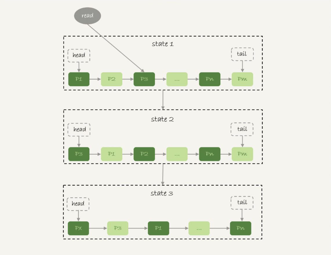 这时候有一个读请求访问P3,因此变成状态2,P3被移到最前面;