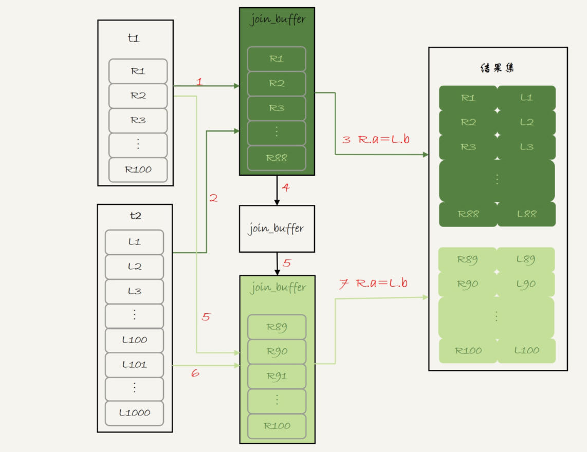 图5 Block Nested-Loop Join -- 两段图中的步骤4和5,表示清空join_buffer再复用。