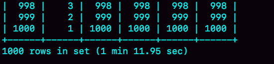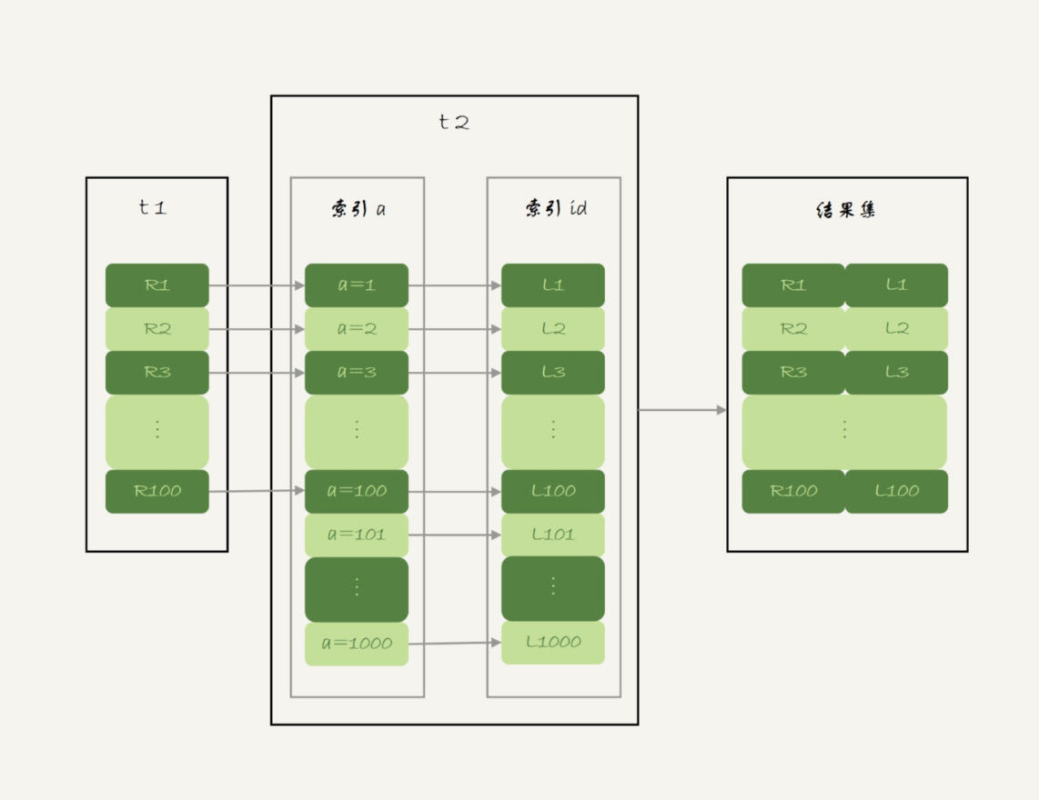 为了便于后面量化说明,我在表t1里,插入了1000行数据,每一行的a=1001-id的值。也就是说,表t1中字段a是逆序的。同时,我在表t2中插入了100万行数据。