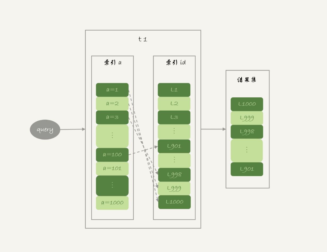 图1 基本回表流程如果随着a的值递增顺序查询的话,id的值就变成随机的,那么就会出现随机访问,性能相对较差。虽然“按行查”这个机制不能改,但是调整查询的顺序,还是能够加速的。