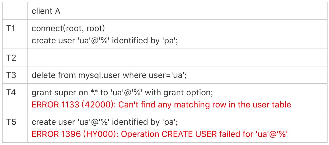 T4时刻给用户ua赋权限失败,因为mysql.user表中找不到这行记录;