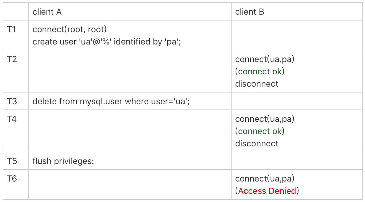 图4 使用flush privileges可以看到,T3时刻虽然已经用delete语句删除了用户ua,但是在T4时刻,仍然可以用ua连接成功。原因就是,这时候内存中acl_users数组中还有这个用户,因此系统判断时认为用户还正常存在。