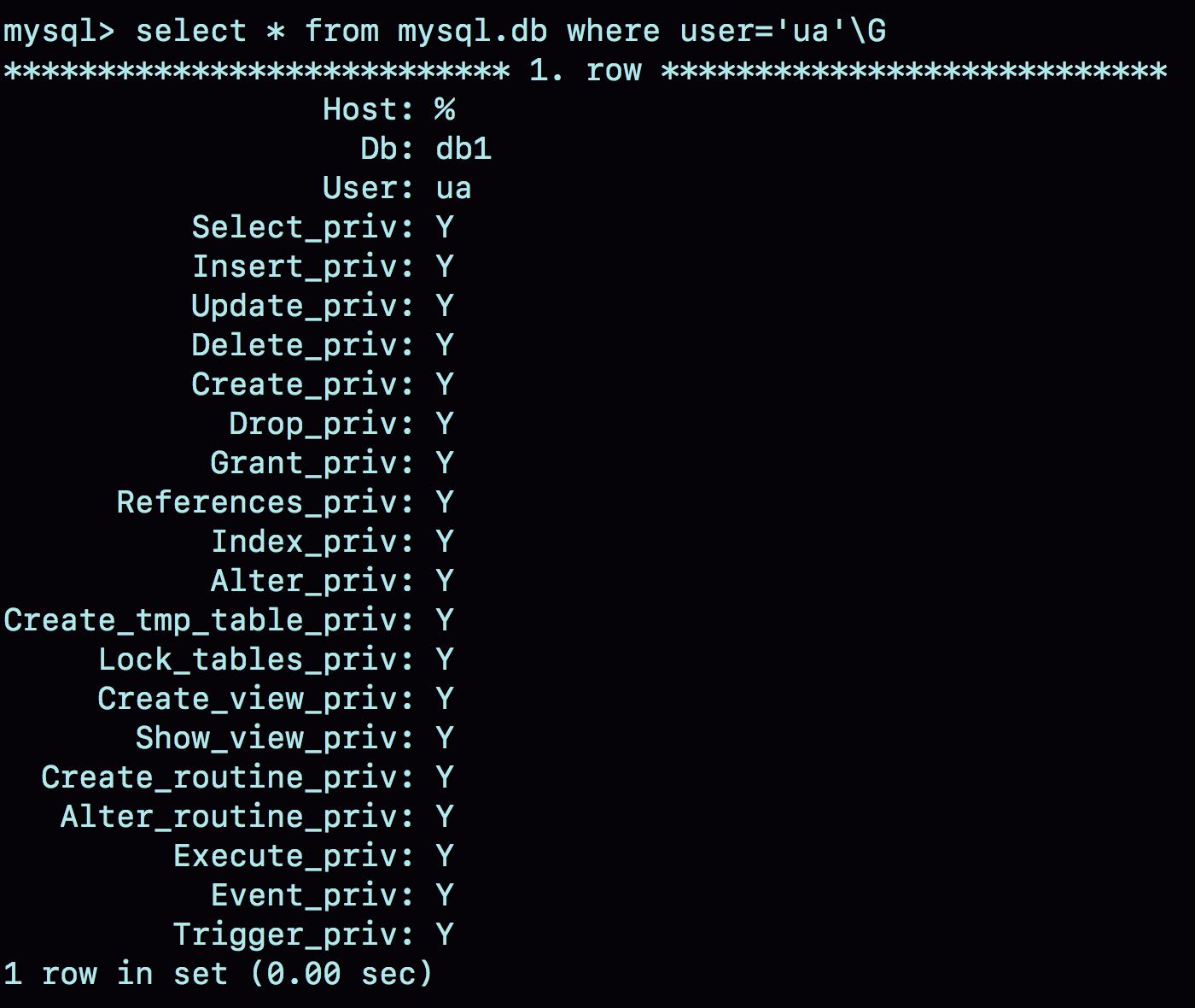 除了全局权限,MySQL也支持库级别的权限定义。如果要让用户ua拥有库db1的所有权限,可以执行下面这条命令: