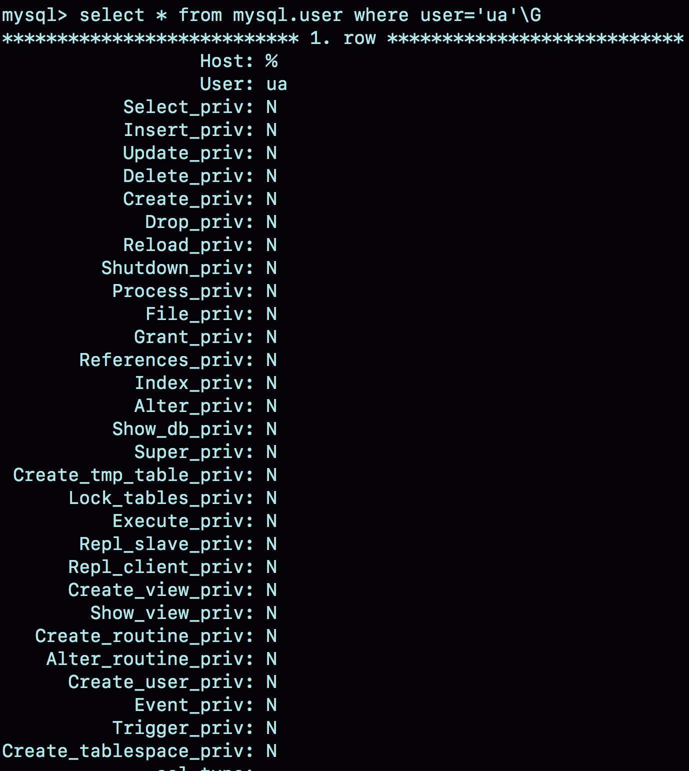 磁盘上,将mysql.user表里,用户’ua’@’%'这一行的所有表示权限的字段的值都修改为“N”;