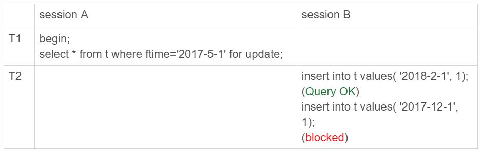 所以,session B要写入一行ftime是2018-2-1的时候是可以成功的,而要写入2017-12-1这个记录,就要等session A的间隙锁。