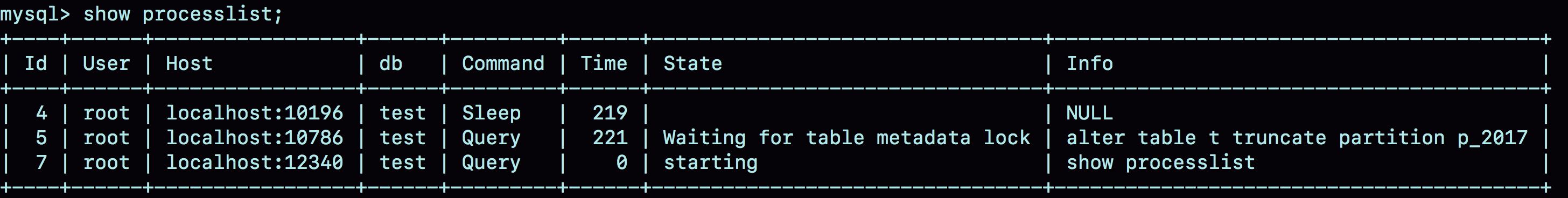 图8 分区表的MDL锁图9 show processlist结果可以看到,虽然session B只需要操作p_2107这个分区,但是由于session A持有整个表t的MDL锁,就导致了session B的alter语句被堵住。