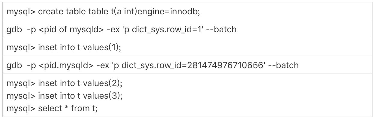 图1 row_id用完的验证序列图2 row_id用完的效果验证可以看到,在我用gdb将dict_sys.row_id设置为248之后,再插入的a=2的行会出现在表t的第一行,因为这个值的row_id=0。之后再插入的a=3的行,由于row_id=1,就覆盖了之前a=1的行,因为a=1这一行的row_id也是1。